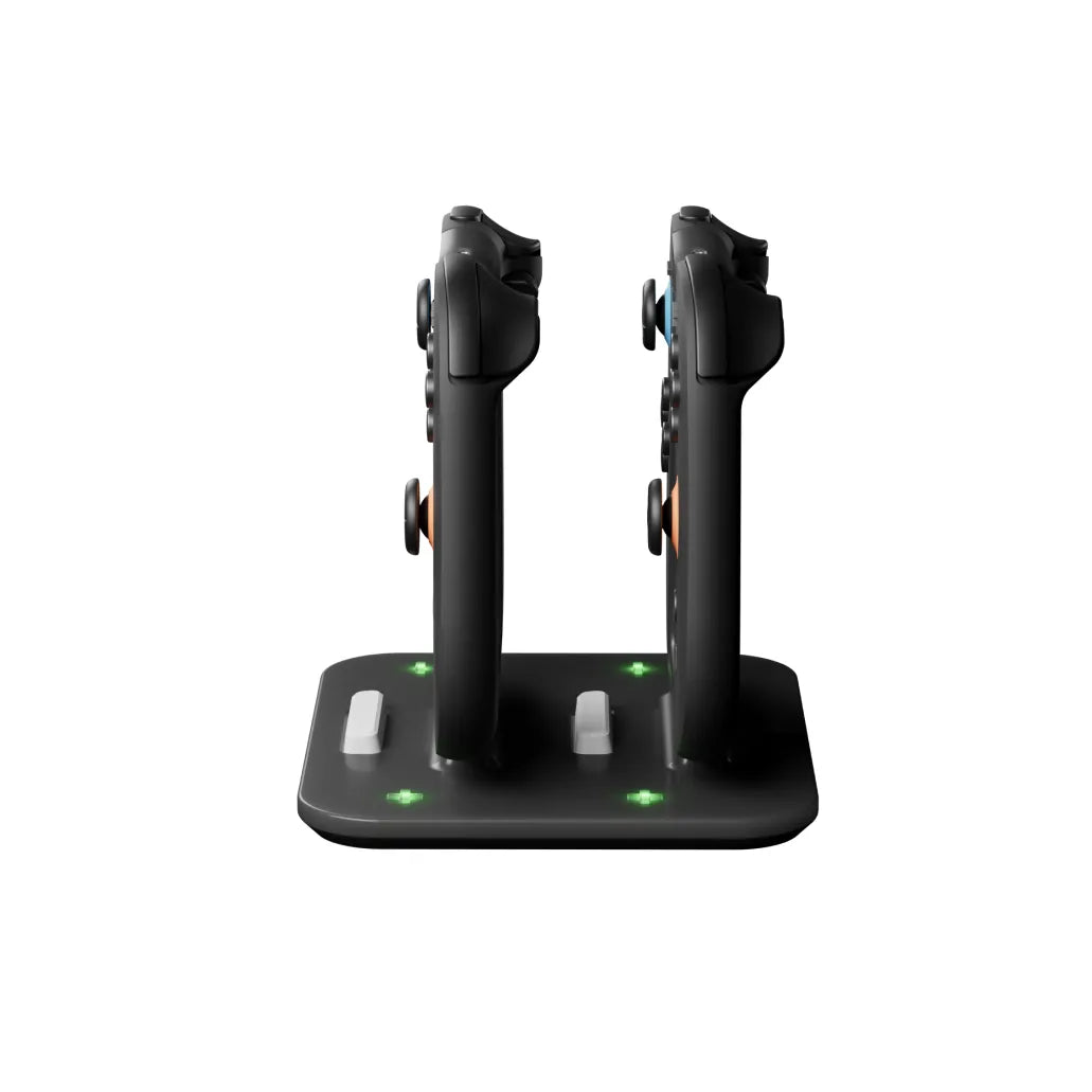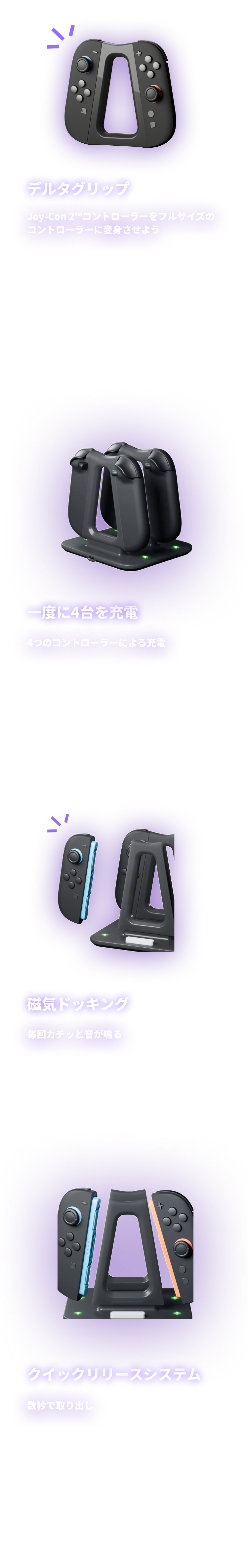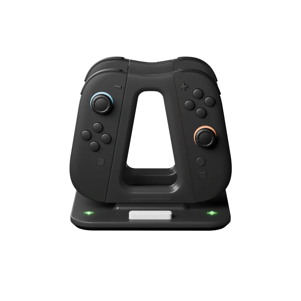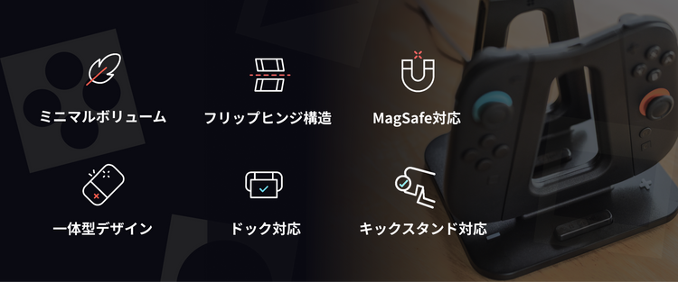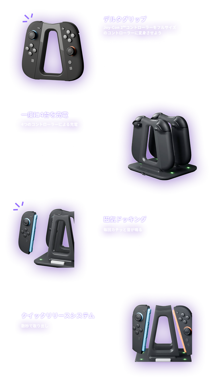 Switchが発売された当初、Joy-Conはたくさんあるのに、充電方法が足りなくて困ったことはありませんか? ドックにコントローラーを出し入れしたり、充電状態を確認して「早く緑になって…」とつぶやいたり——。 私たちにもそんな経験がありました。だからこそジョイステーションは、Joy-Conが4台あっても快適に感じてもらえるよう、こだわりをもって設計しました。 そして何よりすごいのが、Delta Grip(デルタグリップ)。Joy-Conをマグネットでパチッと装着するだけで驚くほどしっかり握れて、まるでProコンのような感覚です。デルタグリップは2台あるので、仲間同士でのプレイにもピッタリです。